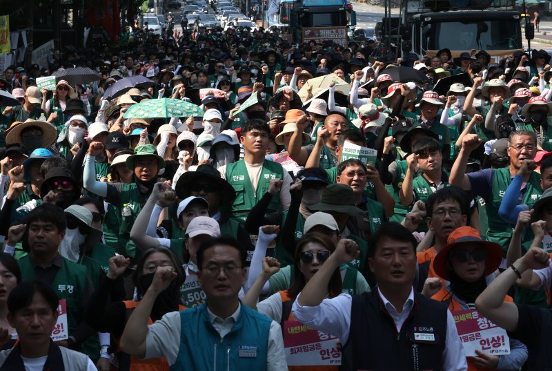 지난 6월 18일 서울 중구 서울지방노동청 앞에서 민주노총이 연 최저임금노동자 민주노총 공동파업대회에서 참가자들이 최저임금 대폭 인상 촉구 등의 구호를 외치고 있다. 연합뉴스