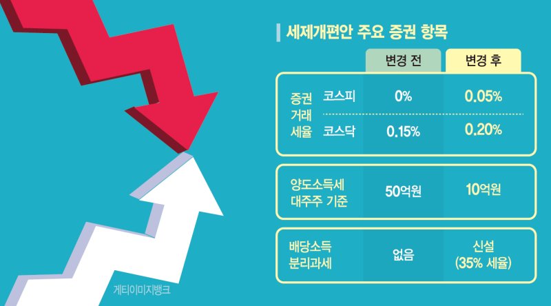 증권시장과 관련된 세제개편안은 △증권거래세율 인상 △대주주 양도소득세 기준 환원 △배당소득 분리과세 신설 등이다. 거래세 인상은 코스피는 0%에서 0.05%, 코스닥은 0.15%에서 0.20%로 각각 조정됐다. 양도소득세는 2023년까지 유지됐던 대주주 기준인 '종목당 10억원 보유' 기준으로 되돌아갔다. 배당소득 분리과세의 최고세율은 35%로 절충했다.