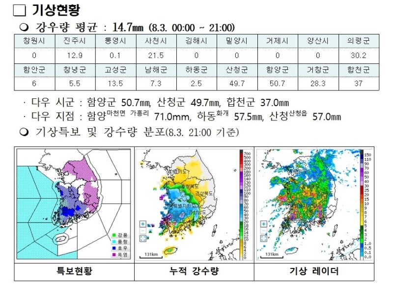 지점별로는 함양군 마천리 가흥리 71㎜, 하동군 화개면 57.5㎜, 산청군 산청읍 57.0㎜를 기록중이다.