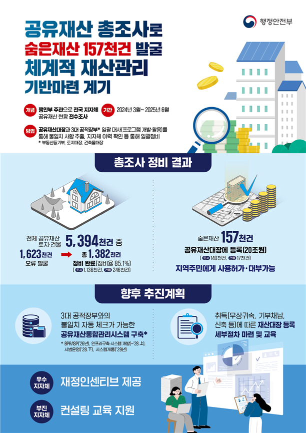 특히, 총 64만 6000 건의 관리누락 재산 중 51만 3000 건을 정비하면서, 공유재산대장에 등록되지 않은 15만 7000 건, 대장가격 기준 약 20조 원 규모의 숨은 재산을 발굴했다.