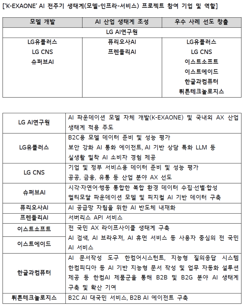 ‘LG 컨소시엄’에는 주관사인 LG AI연구원을 비롯해 △LG유플러스 △LG CNS △슈퍼브AI △퓨리오사AI △프렌들리AI △이스트소프트 △이스트에이드 △한글과컴퓨터 △뤼튼테크놀로지스 등 10개사가 참여한다.