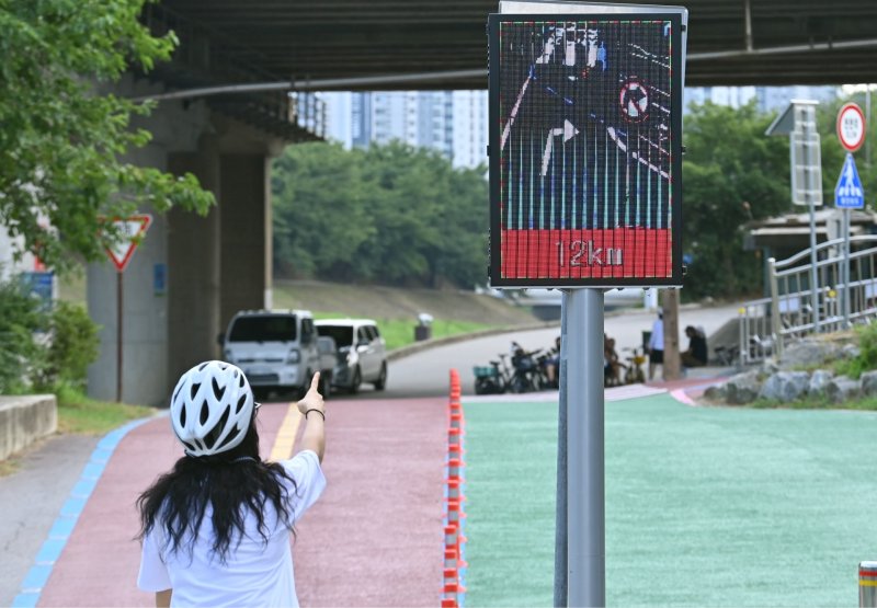 특히 전광판의 경우 평소에는 자전거도로 안전수칙 등이 표시되다가 주변에 10㎞ 이상으로 주행하는 물체가 있을 경우 해당 영상을 전광판으로 송출해 사고를 예방하게 된다.
