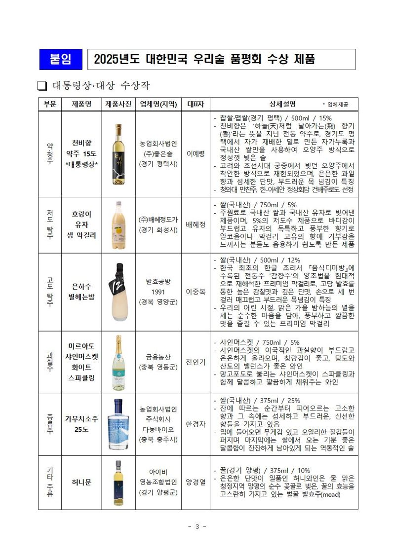 부문별 대상은 ㈜배혜정도가의 ‘호랑이 유자 생막걸리’(저도 탁주), 발효공방 1991의 ‘은하수별헤는밤’(고도 탁주), 금용농산의 ‘미르아토 샤인머스켓 화이트 스파클링’(과실주), 농업회사법인 주식회사 다농바이오의 ‘가무치소주 25도’(증류주), 아이비영농조합법인의 ‘허니문’(기타주류)이 각각 차지했다.