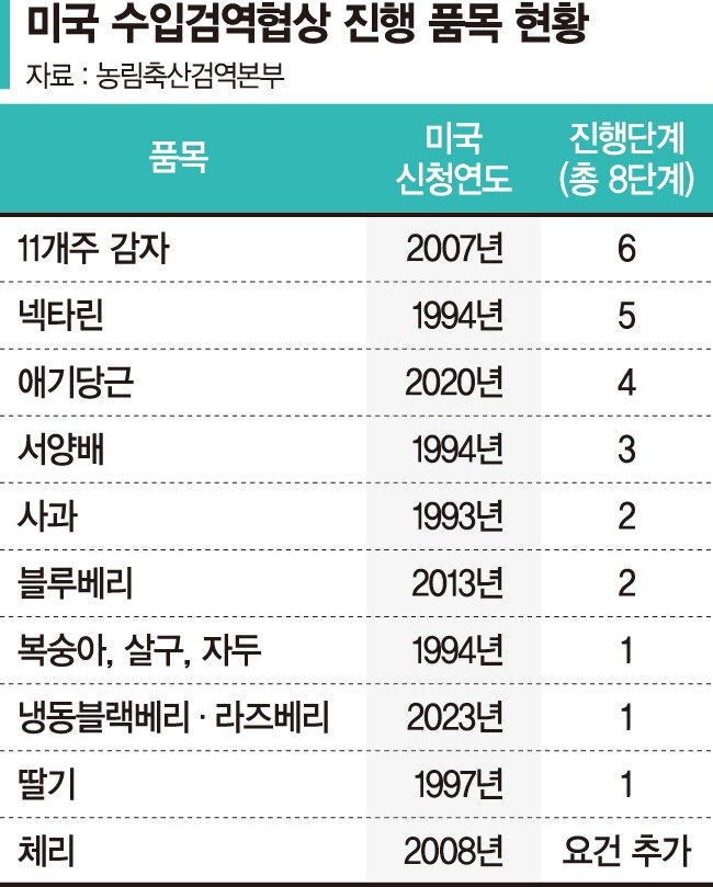 농업 전문가들은 미국이 수출량과 생산량이 많은 농산물을 검역 우선순위로 요구할 수 있다고 봤다.