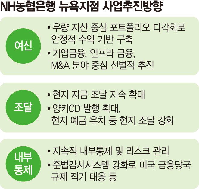 현지 자금조달도 높이고 있다. 자금조달 경로를 다변화하기 위해 최근 양키CD(미국 양도성예금증서) 발행하고 있다. 농협은행 뉴욕지점의 양키CD 발행금액은 지난해 1억5000만달러였고, 올해 상반기에는 3억8000만달러 규모를 발행했다.