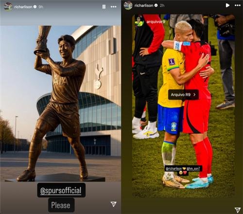 손흥민을 '형'처럼 따랐던 스트라이커 히샤를리송은 인스타그램에 생성형 인공지능(AI)으로 만든 듯한 손흥민의 동상 이미지를 게시하고 "스퍼스, 제발"이라는 문구를 달았다.