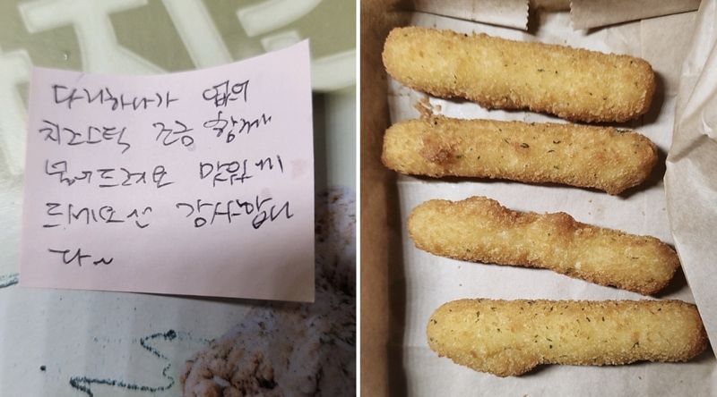 포장된 상자 위에 업주가 적은 손글씨 메모에는 '다리 하나가 없어 치즈스틱 조금 함께 넣어드려요. 맛있게 드세요. 감사합니다'라고 적혀 있었다.