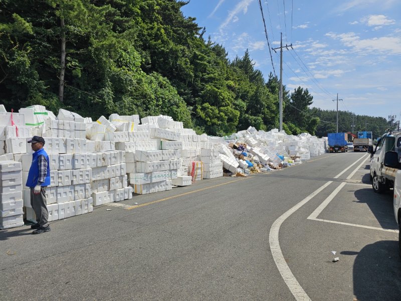 그 옆으로는 군에서 나온 재활용 쓰레기 수거 차량이 쉴새없이 스티로폼 상자를 차량에 옮겨 싣고 있었다.