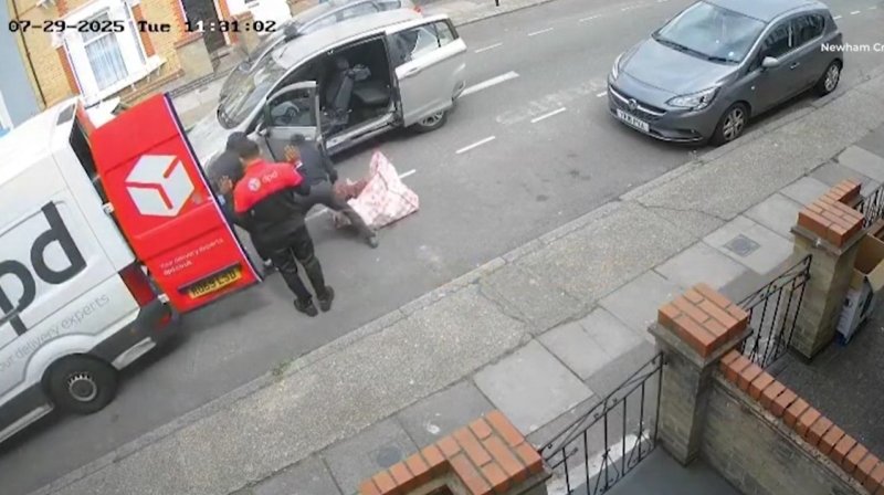겁을 먹은 듯한 택배기사는 양손을 머리 위로 든 채 움직이지 않고 강도들이 택배를 훔쳐가는 것을 지켜봐야 했다.