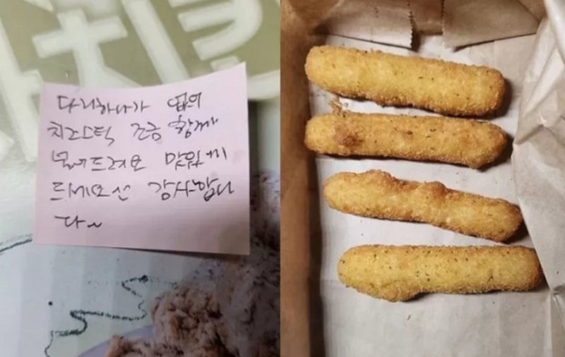 A씨가 직접 촬영한 사진에는 치킨 상자 위에 사장이 직접 작성한 것으로 추정되는 손 글씨 쪽지가 붙어 있었다. 쪽지에는 "다리 하나가 없어 치즈스틱 조금 함께 넣어드린다. 맛있게 드세요^^ 감사합니다~"라는 문구가 적혀 있었다.