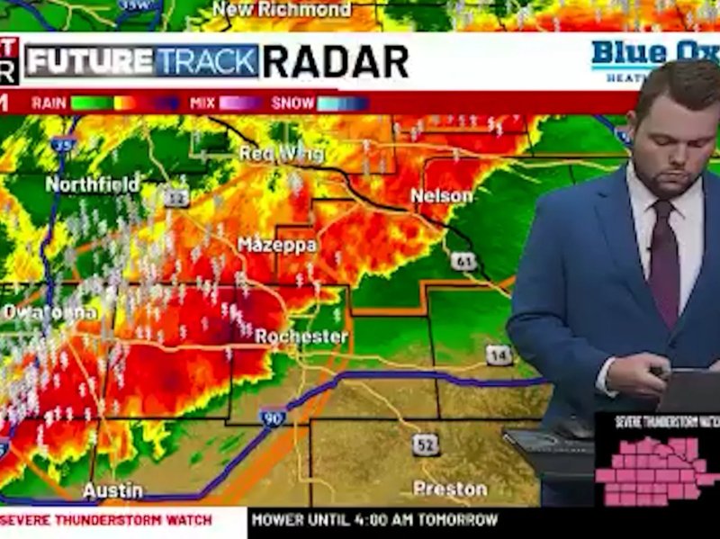 3일(현지 시간) 미 매체 USA투데이에 따르면 지난달 28일 로체스터 지역방송(KTTC)의 기상 캐스터 닉 얀센은 미네소타 남동부와 아이오와 북부 지역에 발생한 폭풍우 상황에 대해 예보 생방송을 하던 도중 아내에게 문자를 보내는 모습을 보였다.