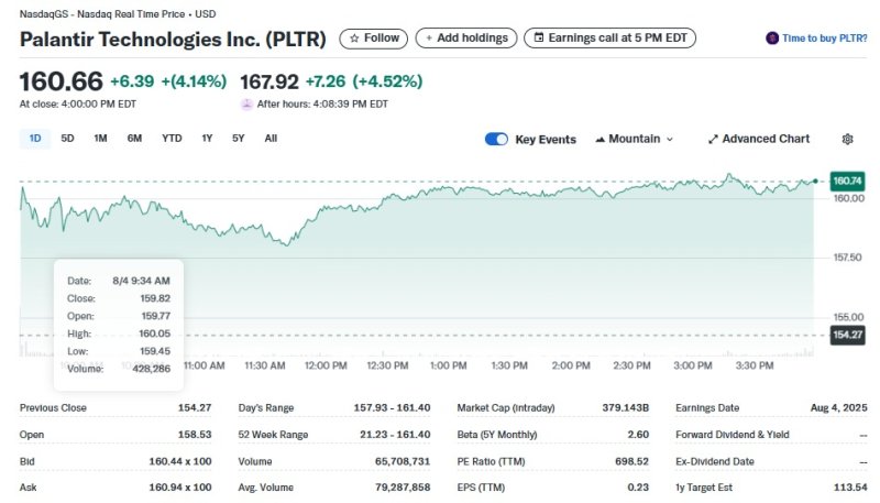 4일(현지 시각) 뉴욕증시 시간외거래에서 팔란티어는 4.52% 급등한 167.92달러를 기록하고 있다. 이는 사상 최고치다. 앞서 정규장도 4.14% 급등, 마감했었다.