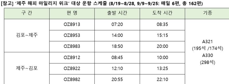 [파이낸셜뉴스] 아시아나항공은 8월부터 9월까지 총 27일간 김포제주 노선의 162편 항공편에서 마일리지 좌석을 대폭 공급하는 ‘제주 해피 마일리지 위크’ 프로모션을 두 차례에 걸쳐 운영한다고 5일 밝혔다.