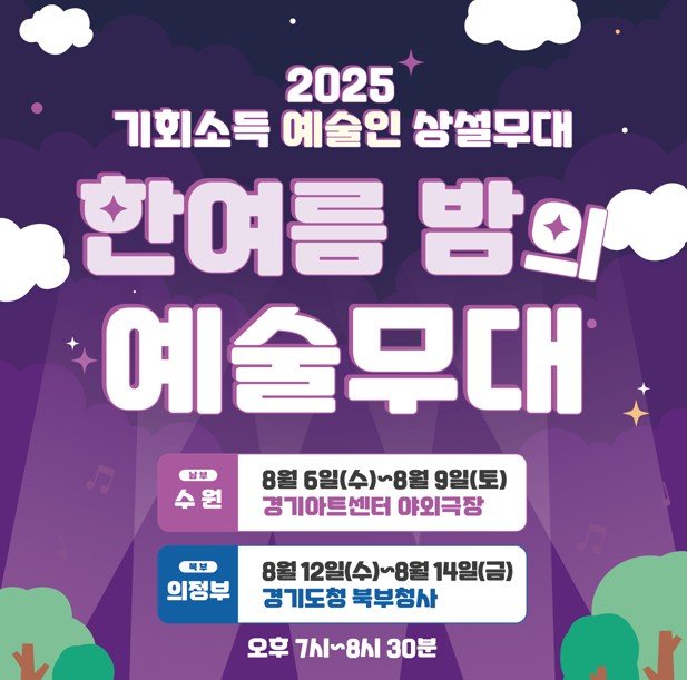 [수원=뉴시스] 박상욱 기자 = 경기도가 6~9일 경기아트센터 야외극장(수원)에서, 12~14일 경기도청 북부청사 경기평화광장(의정부)에서 기회소득 예술인의 특별공연인 '한여름밤의 예술무대'를 무료로 진행한다.