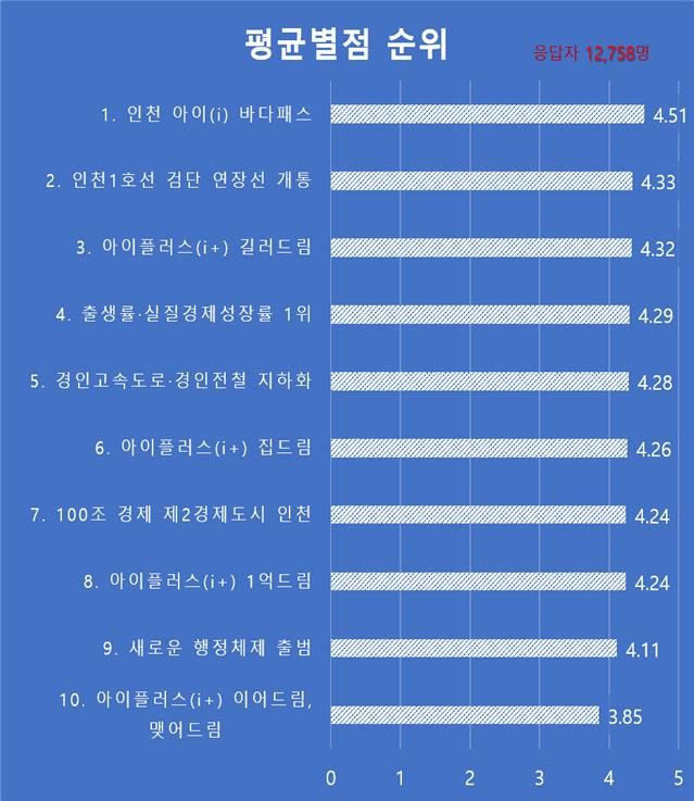 설문조사는 인천시가 추진한 10대 주요 사업을 대상으로 각 사업에 대해 5점 만점의 별점 평가 방식으로 진행됐다.