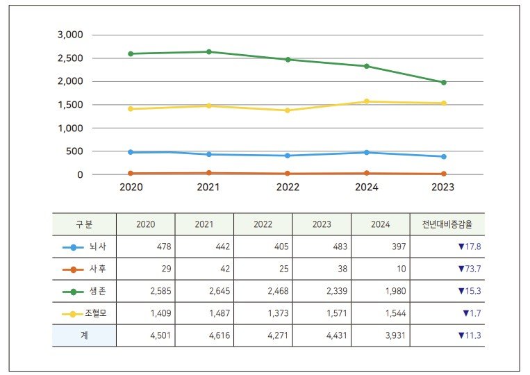 5일 보건복지부 국립장기조직혈액관리원이 지난달 공개한 '2024년도 장기 등 기증 및 이식 통계 연보'에 따르면 지난해 장기 등을 기증한 사람은 3931명으로 전년 4431명 대비 11.3% 감소했다.