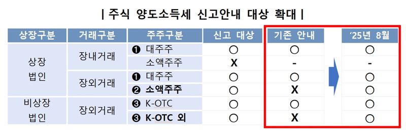 신고 대상 △상장주식을 양도한 대주주 △상장주식을 장외거래한 소액주주 △비상장주식을 양도한 주주 등이다. 단, K-OTC에서 중소·중견기업 주식을 거래한 소액주주는 제외된다.