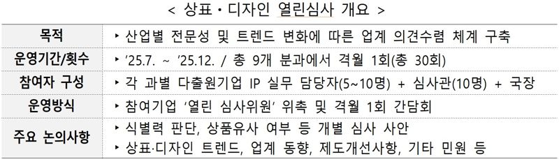 특허청은 지난 달부터 산업별 현장 의견을 직접 듣고, 이를 제도 개선에 반영하기 위해 ‘상표·디자인 열린심사 간담회’를 정례적으로 운영하고 있다. 이 간담회는 총 9개 산업분야 분과별로 기업 실무자와 심사관이 함께 참여해 격월로 열리며, 연말까지 상표·디자인 심사 과정의 불합리한 기준이나 개선이 필요한 사안을 발굴하고, 법령 개정 없이도 고시나 심사기준 등의 행정규칙을 통해 신속히 개선하는 것을 목표로 한다.