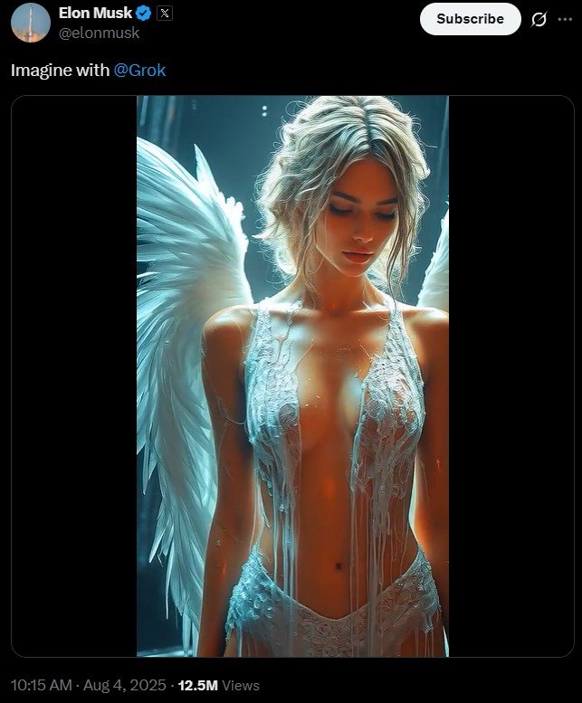 머스크는 이날 본인 엑스 채널에서 잇달아 그록 이매진으로 제작한 영상을 올리는 등 새 기능 홍보에 나섰다. 한 영상에는 얇고 반투명한 흰색 레이스 소재로 된 의상을 입은 한 밝은 금발의 여성을 담았다. 커다란 흰색 천사 날개가 등 뒤에 펼쳐져 있어 '천사' 단어를 프롬프트에 입력한 것으로 추정된다.