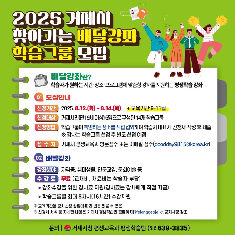 학습그룹 모집 및 서류제출 기간은 오는 12일부터 14일까지이며, 이메일 접수 또는 거제시청 평생교육과 평생학습팀으로 방문 접수하면 된다.