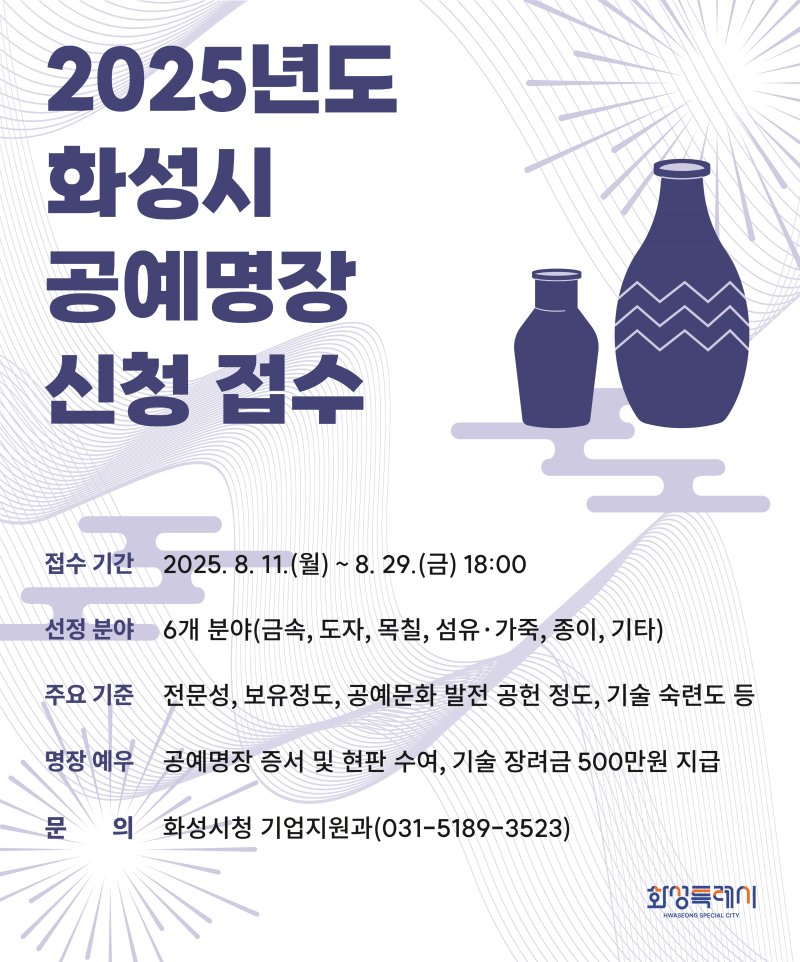 자격요건인 △해당 공예분야에서 15년 이상 종사 △공고일 현재 5년 이상 화성시에 주민등록 △관내 사업장에서 5년 이상 종사 등을 모두 충족하는 공예인이면 누구나 신청할 수 있다.