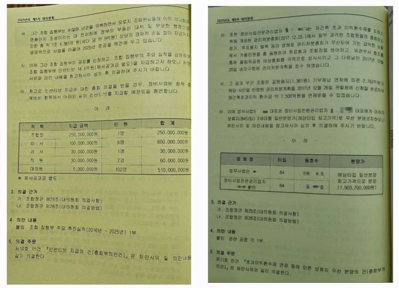 조합 보류지 '특혜'논란, 조합장 성과급 상정 비판에