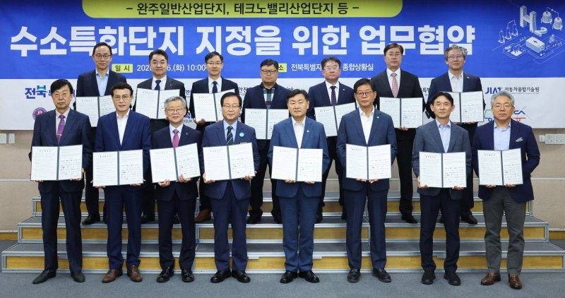5일 전북도청에서 전북도와 완주군, 현대자동차 전주공장, 한국수소연합, 전북대 등 16개 기관이 완주 수소특화단지 지정 공모 대응을 위한 업무협약을 체결했다.