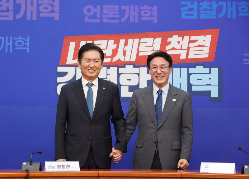 아울러 정 대표는 이날 우 의장을 예방하고 "검찰·언론·사법 개혁, 내란 세력 척결에 따른 여러 입법과 제도개선에 대해 의장님께서 비상계엄 해제할 때의 결연한 심정으로 결단을 많이 해주셨으면 좋겠다"고 말했다.