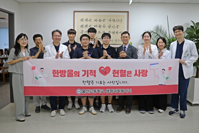 [울산=뉴시스]박수지 기자 = 울산고등학교 생명과학동아리 학생들은 5일 울산대학교병원을 방문해 혈액암 환자들을 위해 헌혈증 170장을 기부했다.
