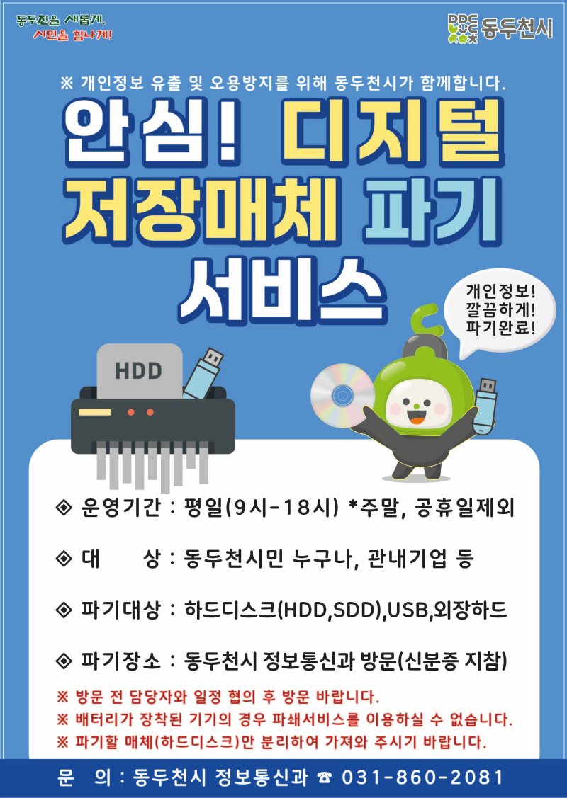 디지털 저장매체 파기 서비스는 평일 오전 9시부터 오후 6시까지 운영된다. 점심시간 및 주말·공휴일은 운영되지 않는다. 이용을 원하는 시민은 본인 확인이 가능한 신분증과 파기할 저장매체를 지참해 시청 정보통신과를 방문하면 된다.