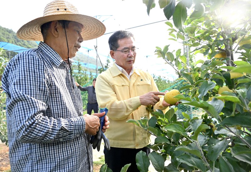 이날 수확 현장에는 김진열 군위군수와 홍성일 경북 1호 사과 명장이 동행했다.