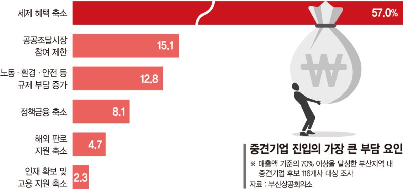 부산상의 조사연구팀 관계자는 "중견기업으로의 도약은 기업의 신뢰도와 이미지 제고, 자금 조달 및 투자 유치 등 여러 면에서 이점도 있지만, 실제 기업들은 정책지원 혜택 축소 등에 부담을 느끼고 있다"면서 "중견기업 성장에 이르기까지 20년 이상 소요되는 만큼 장기적인 시각에서 후보기업들의 중견기업 진입을 유도할 수 있는 실질적인 지원책을 강화할 필요가 있다"라고 밝혔다.