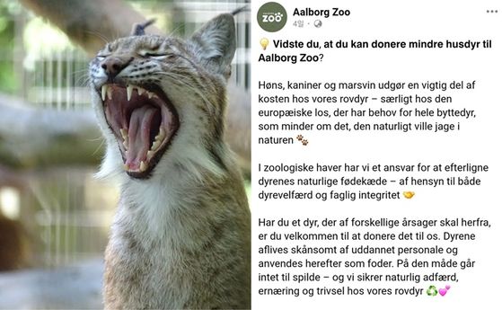 4일(현지시간) BBC, CNN 등 외신에 따르면 덴마크 올보르 동물원은 지난 1일 SNS에 "닭, 토끼, 기니피그 등을 육식동물의 먹이로 기증해 달라. 수명이 얼마 남지 않은 동물들을 환영한다"는 내용의 글을 올렸다.