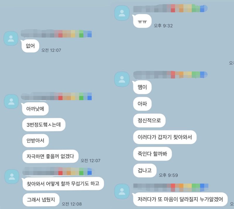 A씨는 당시 가족에게 '(피의자가) 이러다가 갑자기 찾아와서 죽인다 할까봐 겁난다', ‘찾아와서 어떻게 할까 무섭기도 하다’ 등의 메시지를 보낸 뒤, 같이 있어 달라고 요청한 것으로 전해졌다.