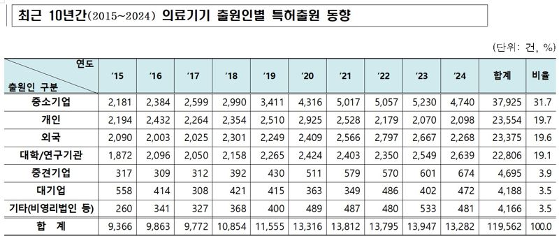 출원인 유형별로는 중소기업 31.7%(3만7925건), 개인 19.7% (2만3554건), 외국법인 19.6%(2만3375건), 대학·연구기관 19.1%(2만2806건) 순이었다. 전체 출원의 51.4%를 차지하는 중소기업과 개인이 의료기기분야 혁신을 주도했다.