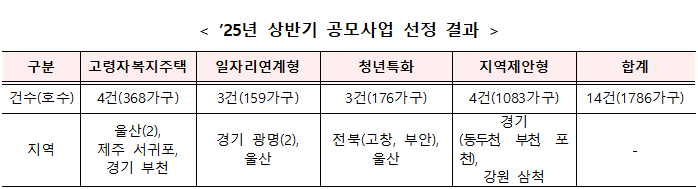 지역제안형 특화주택은 경기도 부천시, 경기도 동두천시, 경기도 포천시, 강원도 삼척시에 총 1083가구 규모로 추진될 예정이다. 고령자복지주택은 울산광역시(2곳·214가구), 경기도 부천시(100가구), 제주특별자치도(54가구)에 총 368가구 규모로 추진된다.