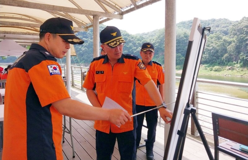 (연천=연합뉴스) 최재훈 기자 = 경기도 북부소방재난본부 강대훈 본부장이 지난 5일 연천군 한탄강교통랜드를 찾아 119 시민수상구조대 운영 현장을 점검했다.