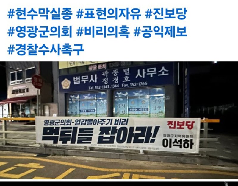 진보당 영광지역위는 정치적 표현의 자유를 침해한 명백한 행위라며 영광경찰서에 수사를 촉구하는 진정서를 접수한 것으로 파악됐다.