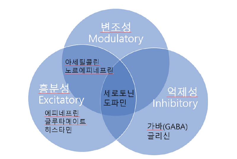 도파민은 의욕, 행복감, 기억, 인지, 운동조절 등에 두루 관여한다. 그래서 도파민이 너무 과도하면 ADHD나 조현병이 발생할 수 있고, 너무 부족하면 치매, 우울증, 파킨슨병이 발생할 수 있다. 신경전달물질에는 ‘흥분성’과 ‘억제성’이 있다.