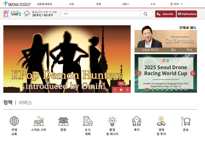서울시는 현재 외국어 누리집 5종(영·중·일·자동번역)을 운영 중이다. 영문 누리집은 하루 평균 방문자 2만 7765명으로 전체 외국어 페이지 중 최다다. 지난 1~6월 기준 해외 접속 비율은 91.3%로, 주요 접속 국가는 미국(19%), 일본(7%), 싱가포르(7%), 프랑스(6.1%) 순이다.