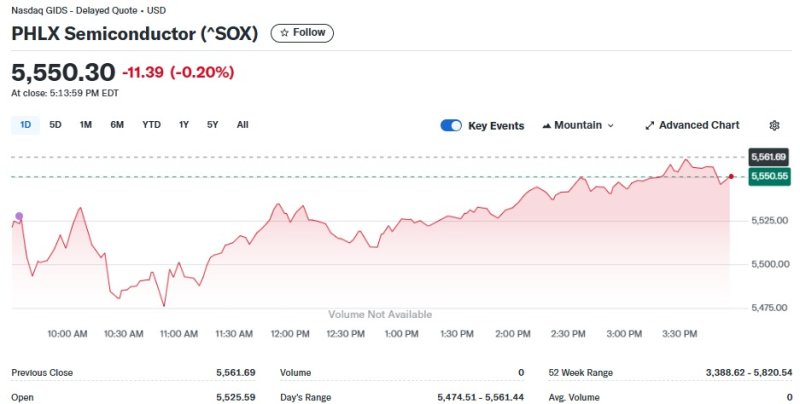 6일(현지 시각) 뉴욕증시에서 반도체지수는 0.20% 하락한 5550.30포인트를 기록했다.