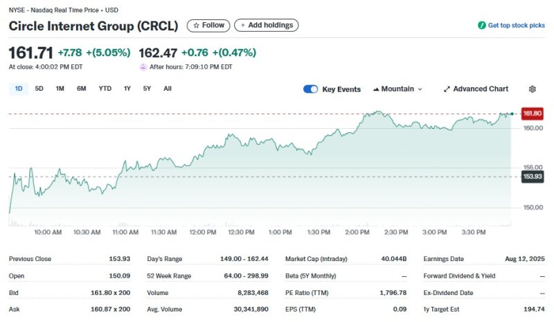 6일(현지 시각) 뉴욕증시에서 서클은 5.05% 급등한 161.71달러를 기록했다.