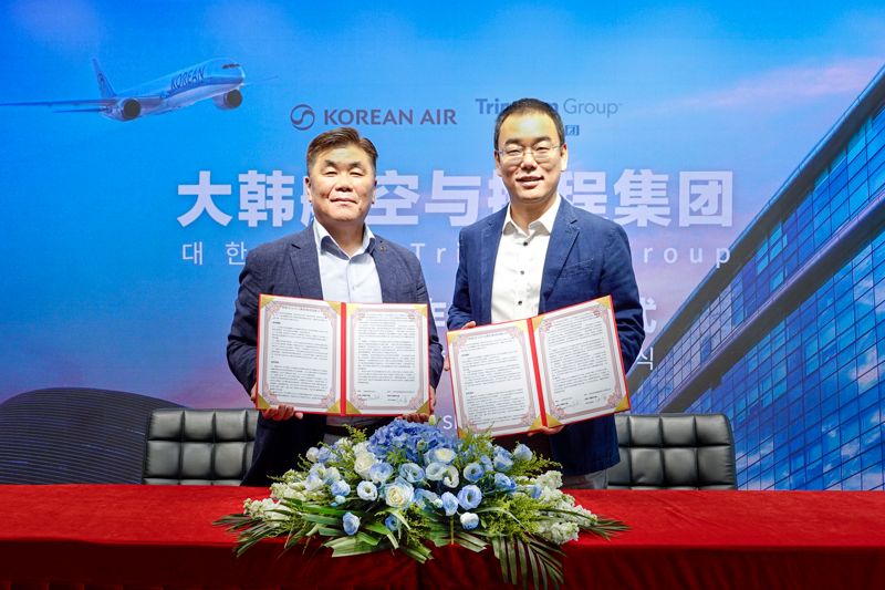 대한항공은 지난 6일 박요한 중국지역본부장이 중국 상하이 트립닷컴 그룹 본사에서 장용 트립닷컴 그룹 항공권사업부 최고경영자(CEO)와 전략적 협력 업무협약(MOU)를 체결했다고 7일 밝혔다.