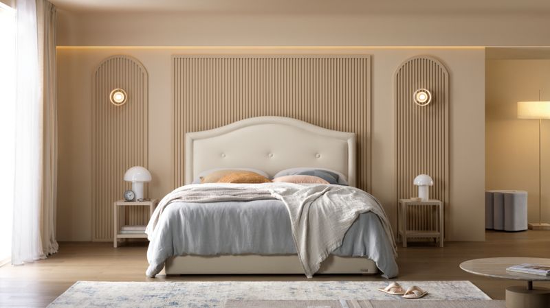플로라 헤드보드는 높이 1288mm 곡선형 디자인을 갖춰 공간 중심을 잡아준다. 또 크림 코튼 패브릭과 뉴트럴 톤 색상을 조합해 호텔 인테리어 느낌을 연출한다.
