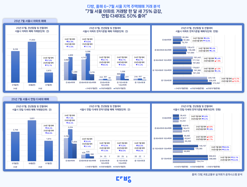 7일 다방에 따르면 올해 7월 거래된 서울 아파트 매매거래량은 2973건으로 지난 6월 1만1933건 보다 75% 감소한 8960건으로 나타났다. 지난해 7월 9236건과 비교해도 68% 하락한 수치다.