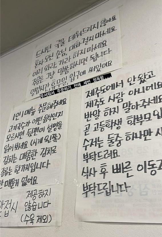 이어 "제주도에서 안 왔고 제주도 사람 아니에요. 반말하지 말아 주세요. 곧 고등학생 학부모입니다. 수저는 둘 중 하나만 사용 부탁드려요. 식사 후 빠른 이동 부탁드립니다"라는 당부도 담겼다.