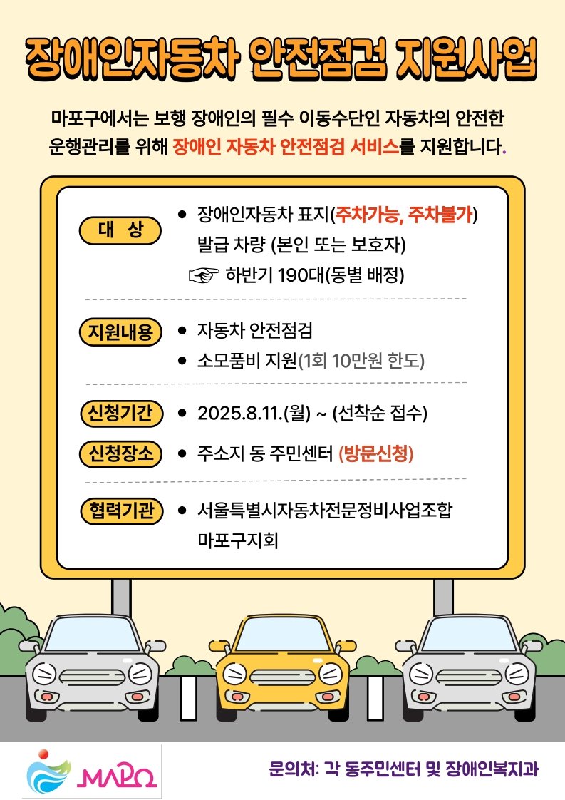 '장애인 자동차 안전점검 지원사업'에 대한 자세한 내용은 마포구청 장애인복지과(02-3153-8873)로 문의하면 안내받을 수 있다.