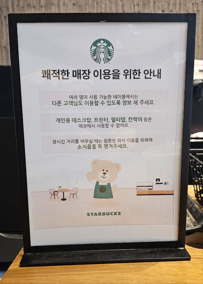 스타벅스코리아는 매장에서 개인용 데스크톱 컴퓨터를 비롯해 프린터·칸막이·멀티탭의 사용을 제한하기로 결정, 전국 매장에 공지했다고 7일 전했다. 매장 공지는 지난 6일부터 시작했다.