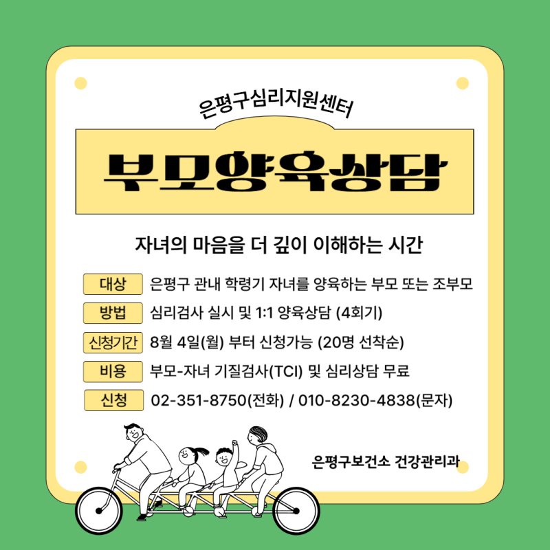 이번 상담은 은평구보건소 심리지원센터가 기획한 사업으로 '자녀의 마음을 더 깊이 이해하는 시간'을 주제로 진행된다. 참가자는 성격기질검사(TCI)를 통해 자녀와 양육자의 기질적 특성을 파악하고, 심리상담 전문가의 도움을 받아 맞춤형 양육 상담을 총 4회 무료로 받을 수 있다.