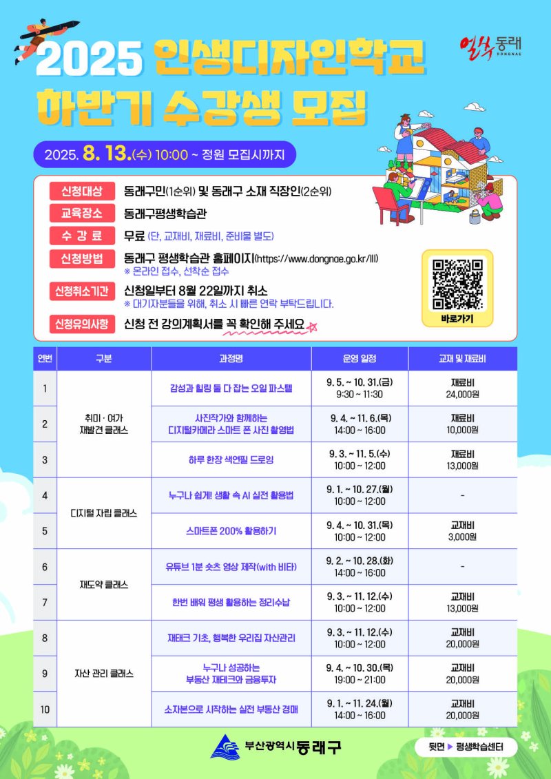인생디자인 학교는 배움의 즐거움과 평생교육을 통한 성장, 새로운 도약을 지원하는 사업이다. 하반기에는 총 10개 강좌가 운영되며, 크게 취미·여가, 디지털 자립, 재도약, 재무 분야로 구성된다.
